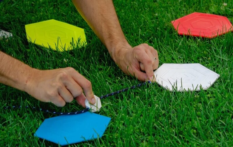Flat Bocce is played using hexagonal discs called “flabs” and a target disc called “the Jack.”